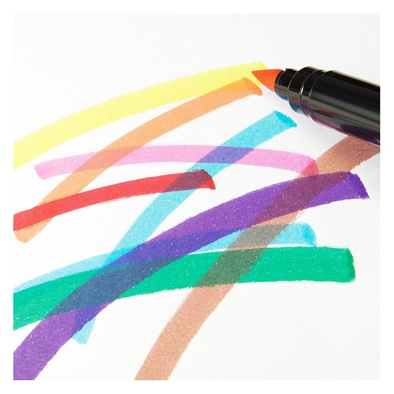 Komplet pisaków do kolorowania, malowania, brushletteringu oraz scrapbookingu. Elastyczna filcowa końcówka pozwala tworzyć linie o szerokości od 0,5 do 6 mm. Jasne, transparentne i żywe kolory można ze sobą mieszać tworząc nowe odcienie. Każdy pisak zaopatrzony jest w skuwkę zabezpieczającą przed wysychaniem. Tekturowe opakowanie zawiera 10 podstawowych kolorów.